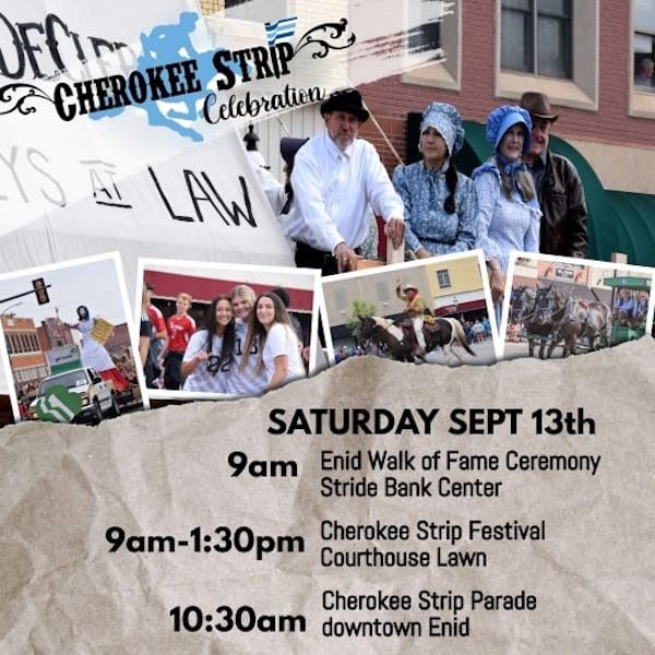 Mark your calendar. The Cherokee Strip Celebration is Saturday, September 13th! Registration is open for vendors and parade participants! Find the forms online at www.enidchamber.com.