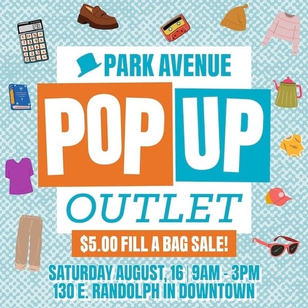The Park Avenue Thrift 4th Annual Outlet Sale will be INDOORS this year! It will take place at the PARK AVENUE POP UP OUTLET, their BRAND NEW retail space located at 130 E. Randolph on the corner of 2nd & Randolph!